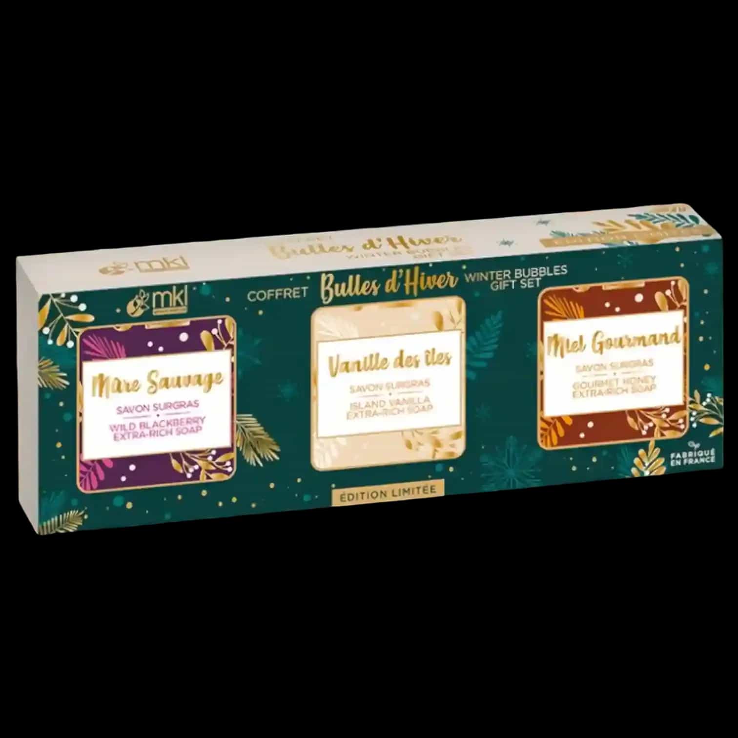Célébrez l'hiver avec le Coffret Douche d'Hiver MKL. 3 Gels Douche 3-en-1 (100ml) aux parfums de fête : Pain d'Épices, Cannelle, Mûre. Made in France.